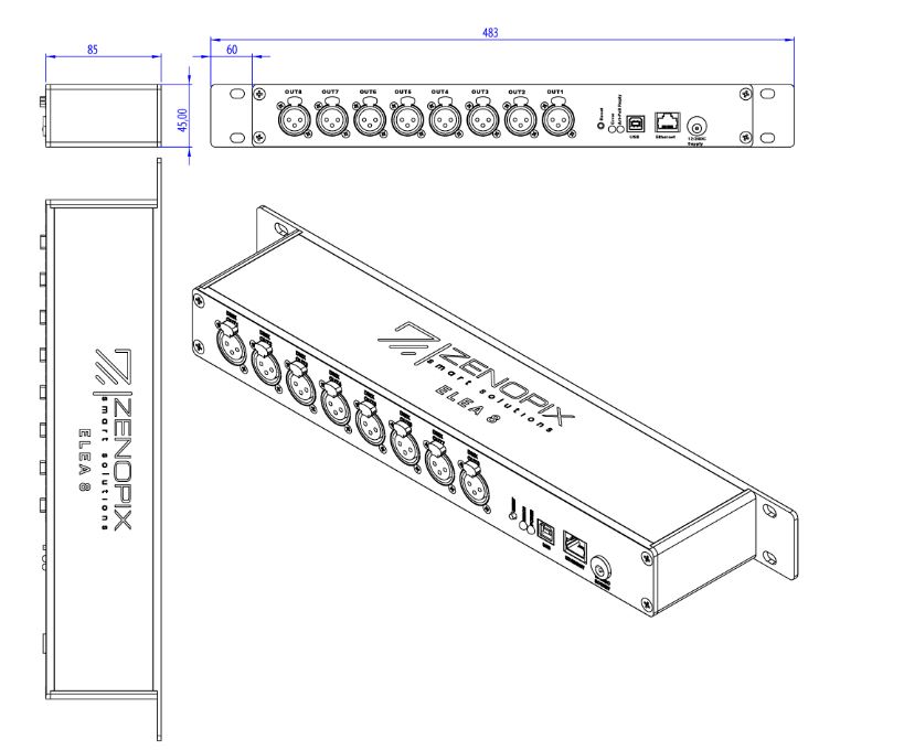 Equipped with a high-speed ARM processor, Zenopix ELEA 8 delivers stable and reliable performance. With 8 XLR DMX output ports, it can control up to 8192 channels, making it suitable for LED dot matrix, stage lighting, and Art-Net-based effect lighting systems. Additionally, easy access and configuration via a web interface makes setup and operation simple and practical.