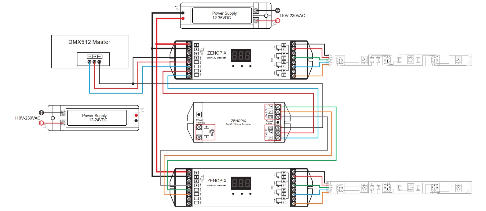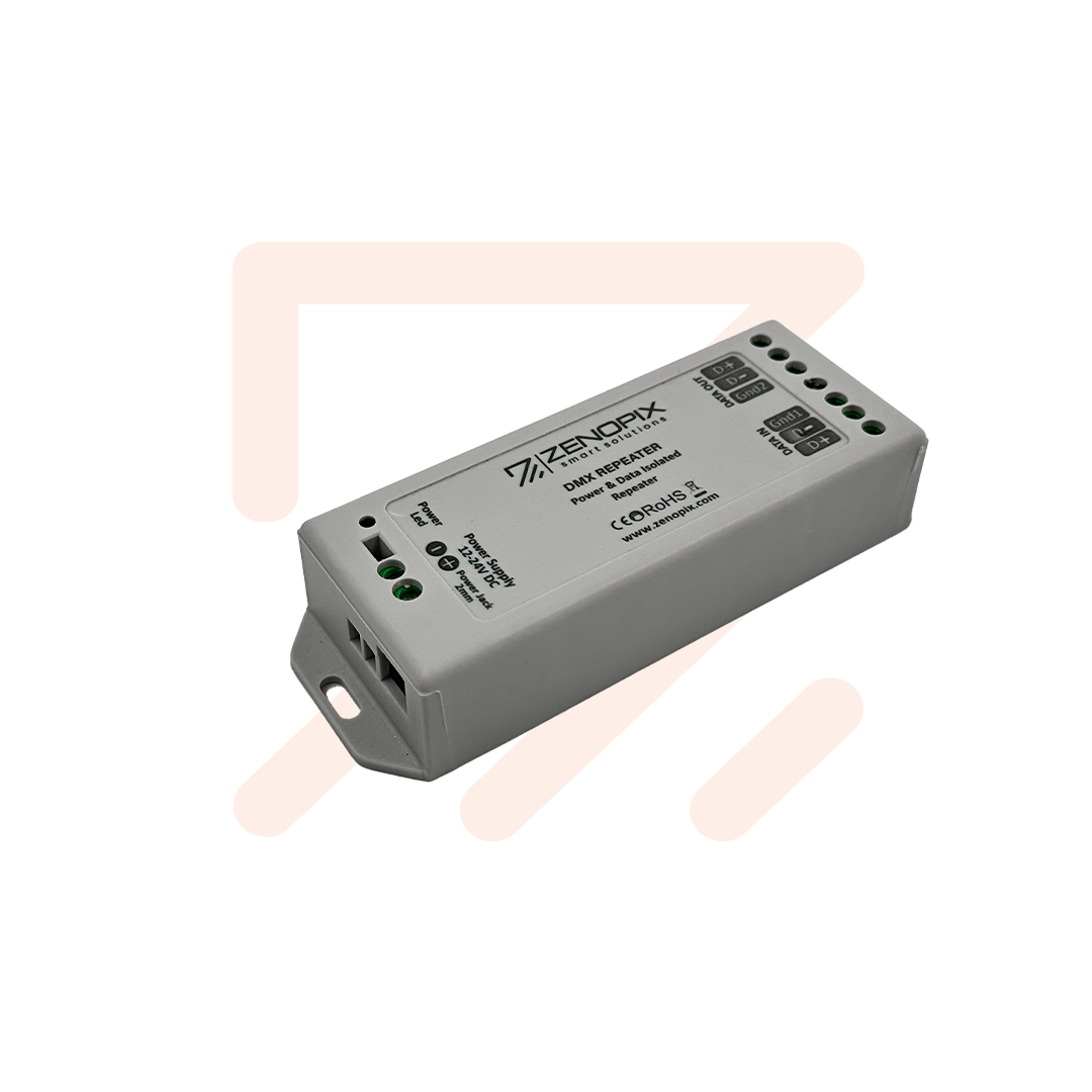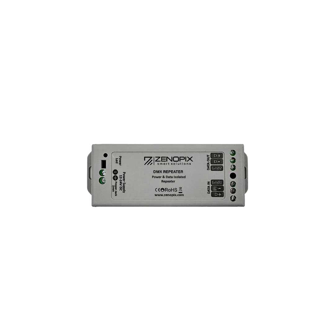 ZENOPIX DMX Sinyal Güçlendirici (Repeater), DMX512 (1990) standart protokolüne uygundur. Bu cihaz, bir DMX sinyal amplifikatörüdür. DMX kod çözücü serisi ile birlikte, gerçek zamanlı aydınlatma projelerinde DMX sinyalini genişletmek için kullanılır. Opto-izolatörlerden oluşan bu ürün, geniş aydınlatma sahaları için vazgeçilmezdir. DMX sinyal güçlendiriciler ve tekrarlayıcılar, DMX ürünlerini elektrik arızalarından korur. Sistem, farklı kablolama konfigürasyonlarına izin verir.