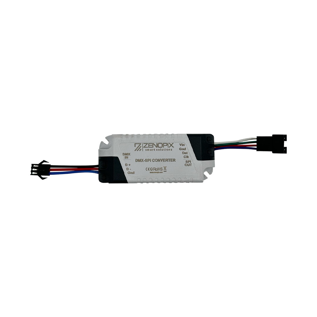 Zenopix DMX – SPI dönüştürücü, DMX512 sinyalini SPI (TTL) dijital sinyaline dönüştüren kompak bir cihazdır. Bağımsız bir SPI kontrol cihazı olarak çalışabilir veya DMX512 kontrol sinyaliyle uyumlu bir DMX dönüştürücü olarak kullanılabilir.