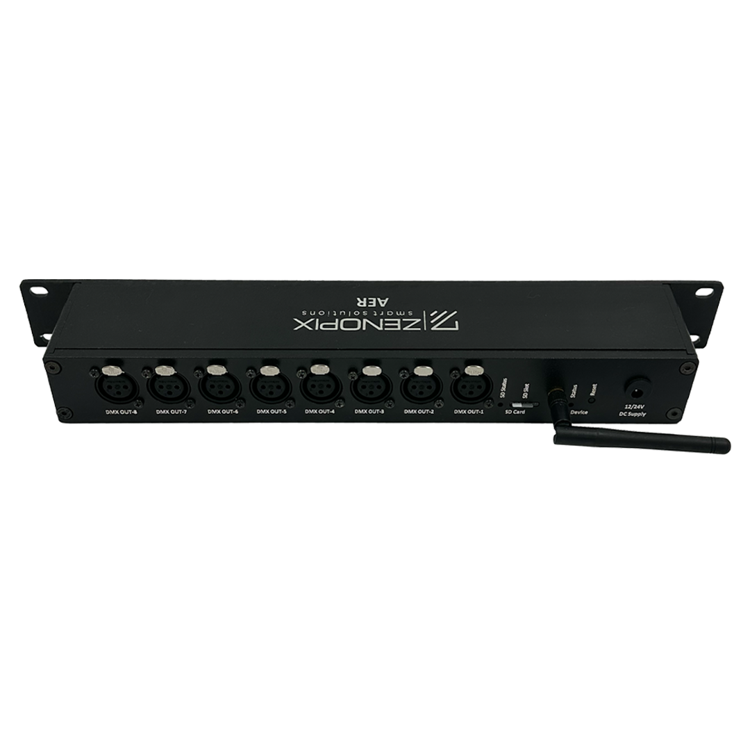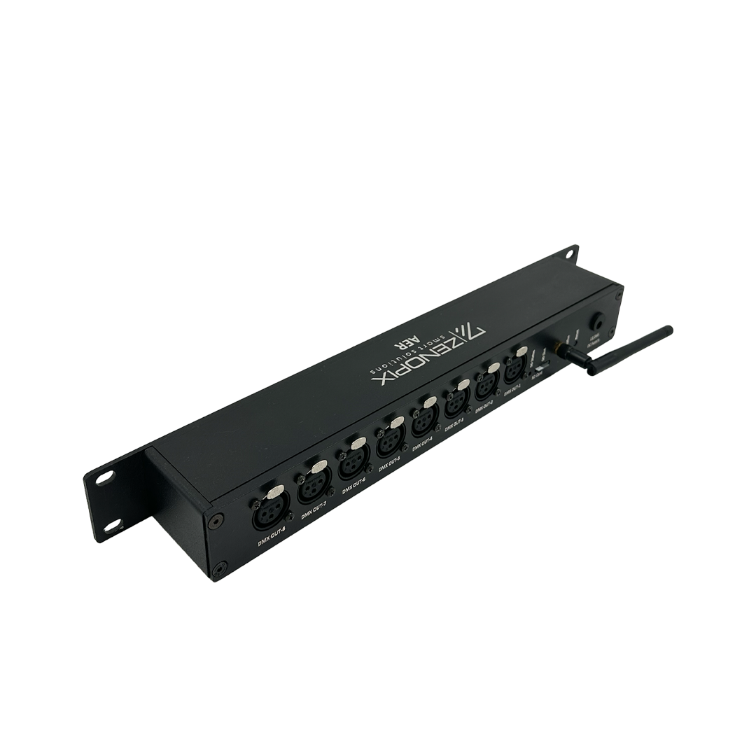 Zenopix AER, SD karta kayıtlı animasyonları web arayüzü üzerinden yönetip oynatabilmenizi sağlayan gelişmiş bir Art-Net DMX kontrol cihazıdır. Cihaz, 8 evren XLR çıkış portu ile DMX verilerini etkili bir şekilde alıcılara iletir ve sahada bilgisayara ihtiyaç duymadan animasyonlarınızı doğrudan Zenopix AER üzerine kaydetmenizi mümkün kılar. Mikro SD karta kaydedilen animasyonlar sayesinde 8 farklı evrende eş zamanlı animasyon gösterimi yapabilirsiniz.