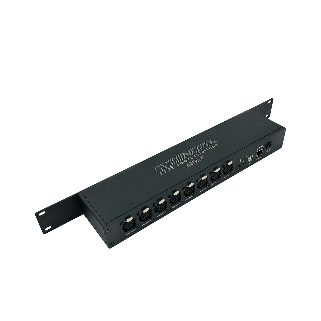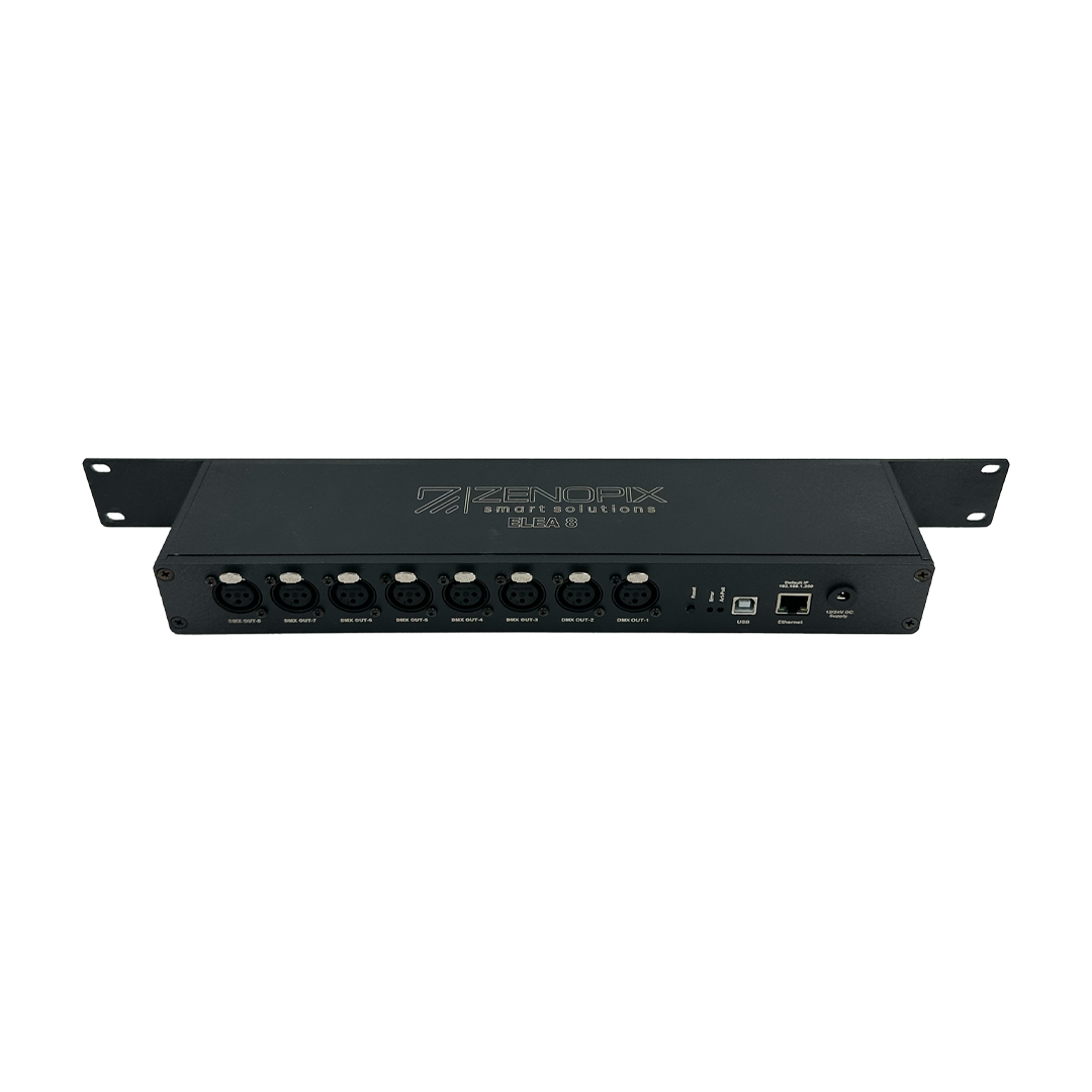 Zenopix ELEA 8 TB, modern sahne aydınlatmaları için ideal, çok yönlü bir ArtNet–DMX dönüştürücüsüdür. Cihaz, Ethernet üzerinden gelen Art-Net paketlerini alır ve DMX-512 çıkışı olarak armatürlere iletir.