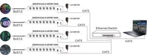 Zenopix ELEA 8 TB ArtNet DMX Kontrolcü, DMX-512 protokolü sayesinde LED aydınlatma ve sahne kontrol sistemleri için ideal bir çözümdür. Cihaz, ethernet üzerinden gelen Art-Net paketlerini alır ve DMX-512 çıkışı olarak armatürlere iletir.